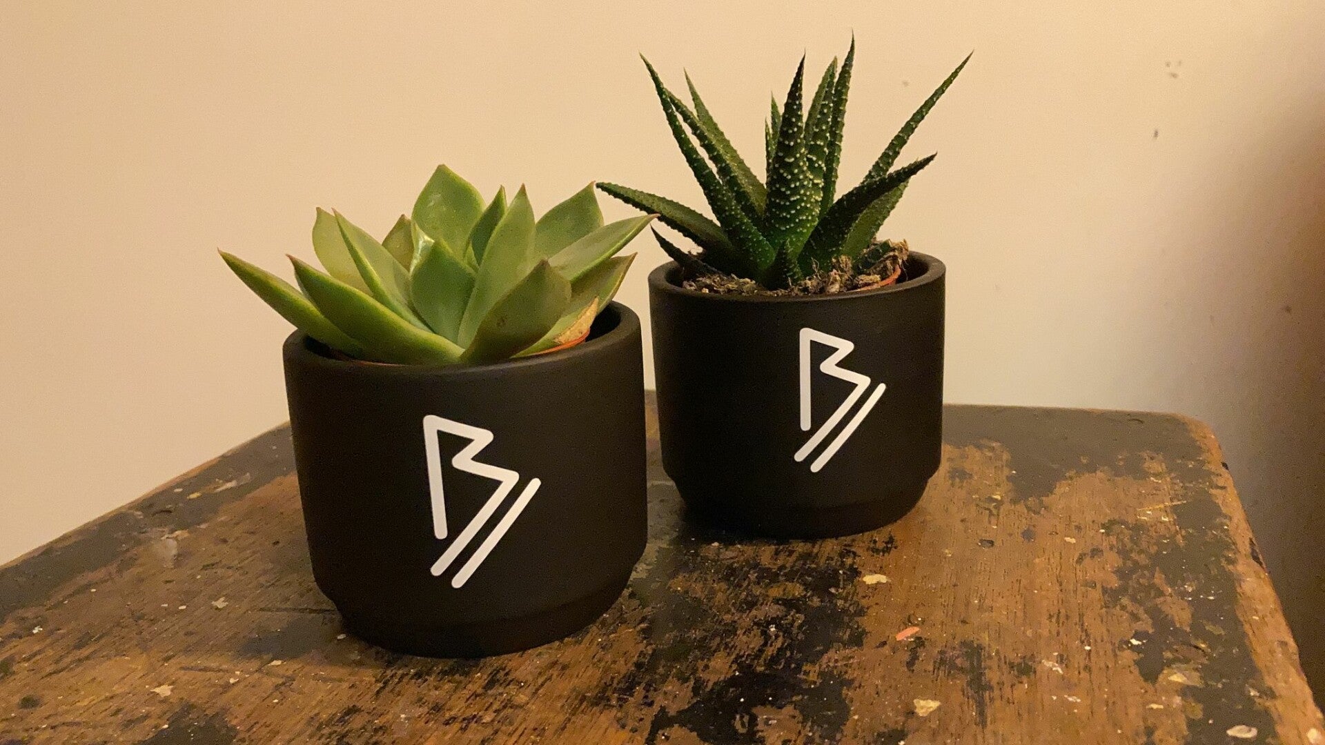 Een duo van 2 zwarte bloempotjes. De bloempotjes zijn van keramiek en bevatten een vetplant.